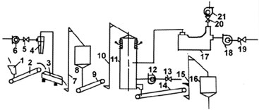 | 1.料斗 2.皮帶輸送機 3.篩分機 4.除塵器 5.風量調節(jié)器 6.風機 7.提升機 8.前儲倉 9.皮帶輸送機 10.提升機 11.干燥機 12.冷風機 13.風量調節(jié)器 14.皮帶輸送機 15.提升機 16.后儲倉 17.熱風爐 18.熱風機 19.風量調節(jié)器 20.風量調節(jié)器 21.引風機 |